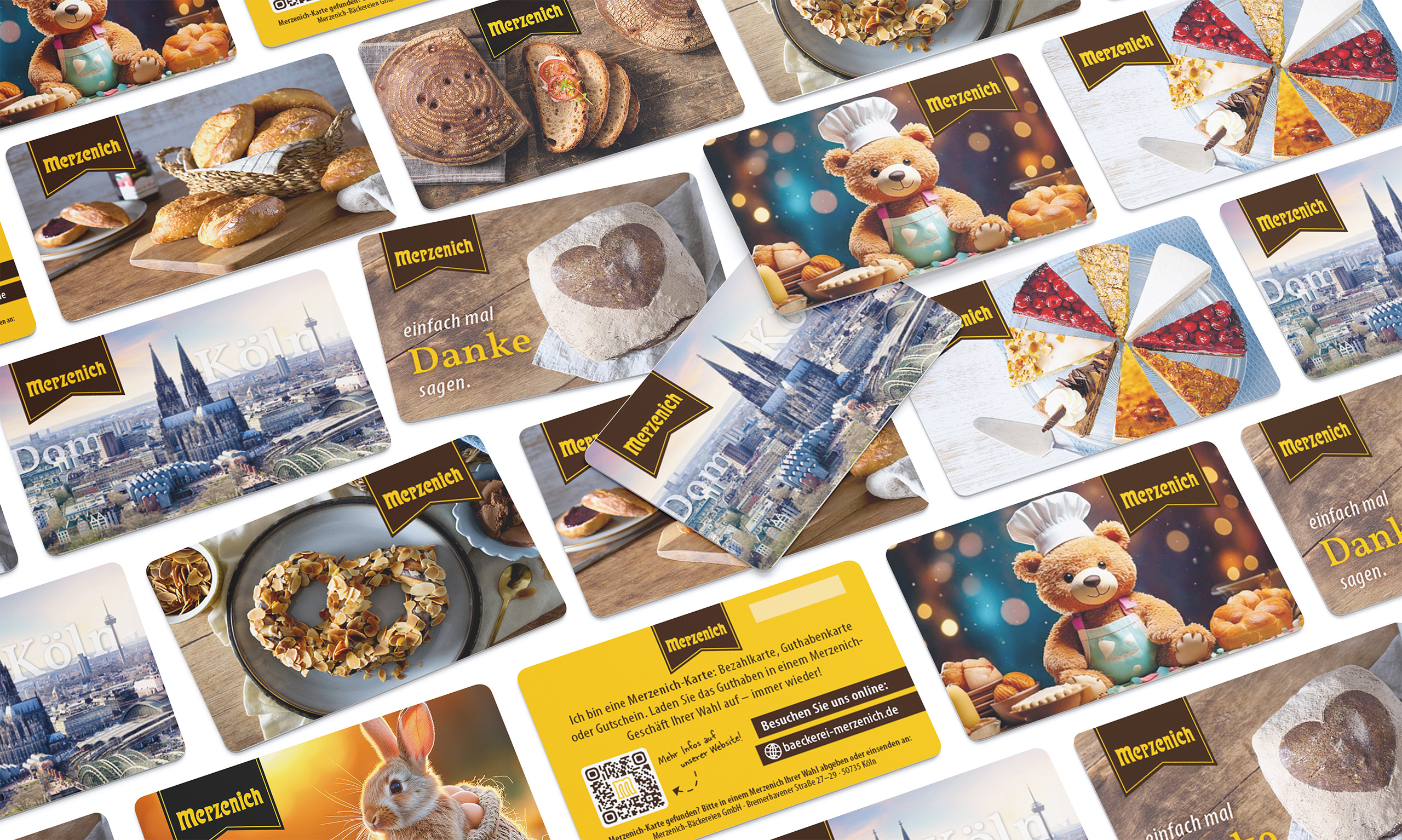 Unsere Kundenkarte im praktischen Standard-Kreditkartenformat passt mühelos in jede Geldbörse. Ob Sie ein leidenschaftlicher Köln-Liebhaber sind, Merzenich-Freund, „Danke“-Sager, Glückwünsche überbringen wollen oder eine vielseitige Geschenkidee suchen – unsere Kundenkarte hat für jeden das Richtige.